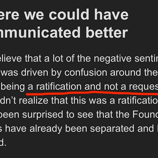 Referring to "Steps to Implement" is already problematic, as there should have been a section using past tense to describe actions already taken. This might have improved communication regarding the ratification; however, they seem to deflect responsibility by implying that the information was there, but overlooked. The proposal's language hints at future plans without explicitly mentioning past actions already executed in AIP-1.